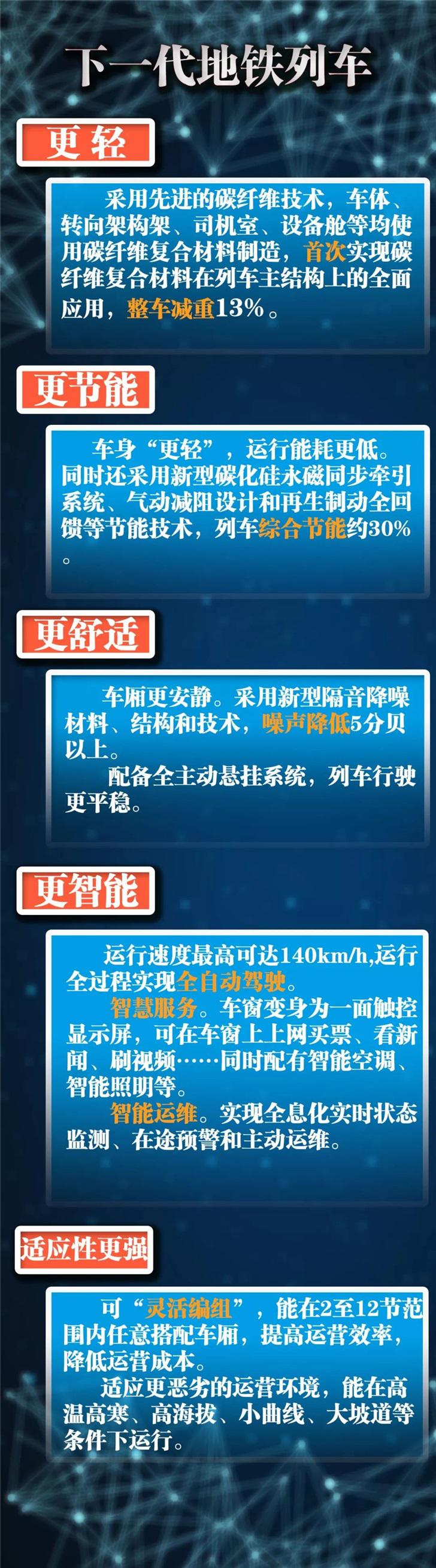 下一代地铁列车采用大量先进新材料、新技术、新系统,与传统地铁相比,具有更轻、更节能、更舒适、更智能、适应性更强等显著的技术优势,代表着地铁车辆未来技术发展方向,有着 " 未来地铁 " 之称。